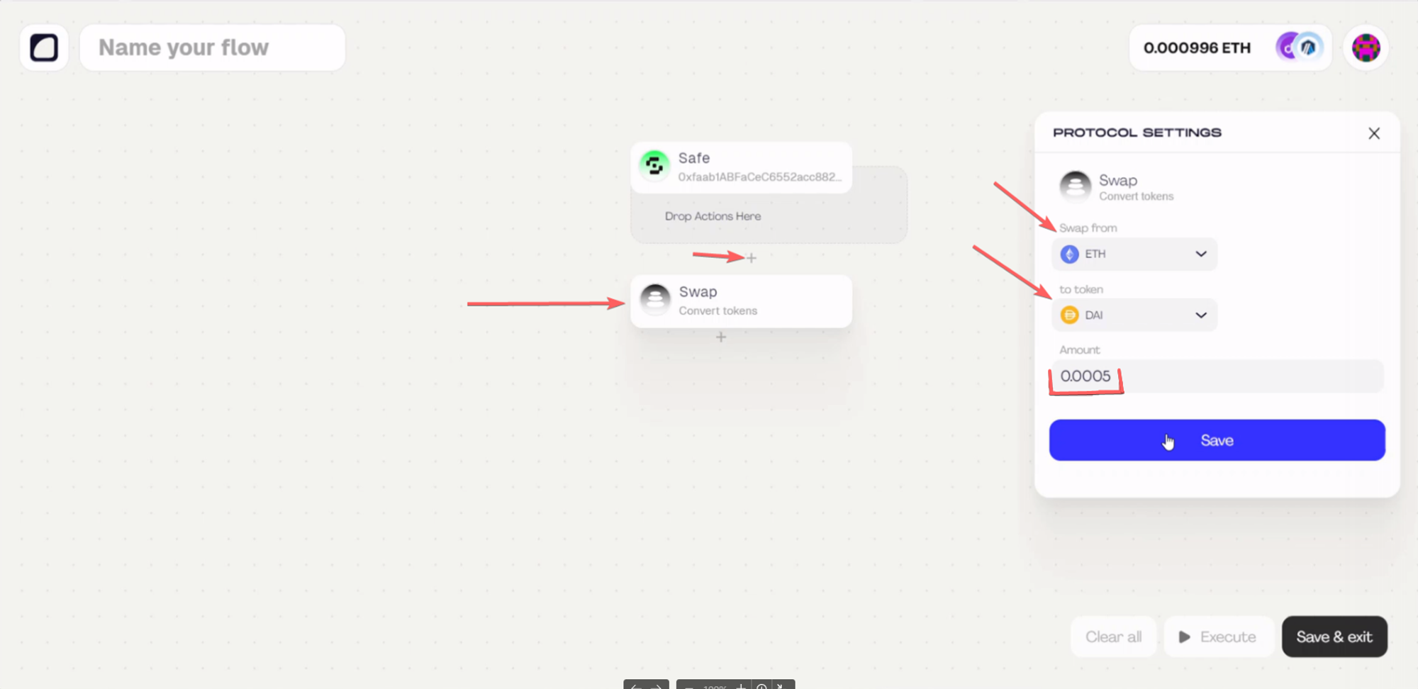 19. On the board of this project click on the "Swap" block from Balancer and choose how much $DAI you want to swap into $ETH. After that click on the "Save" button